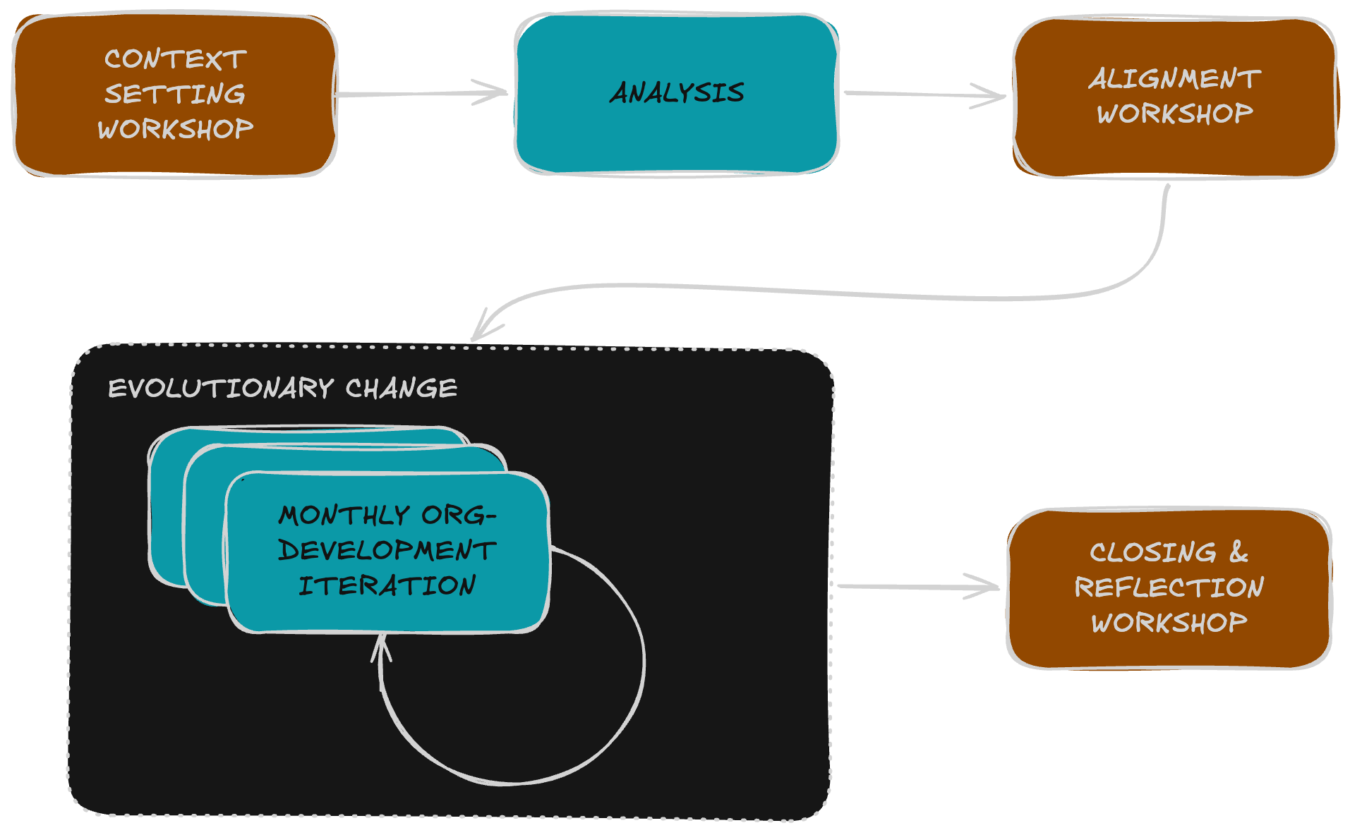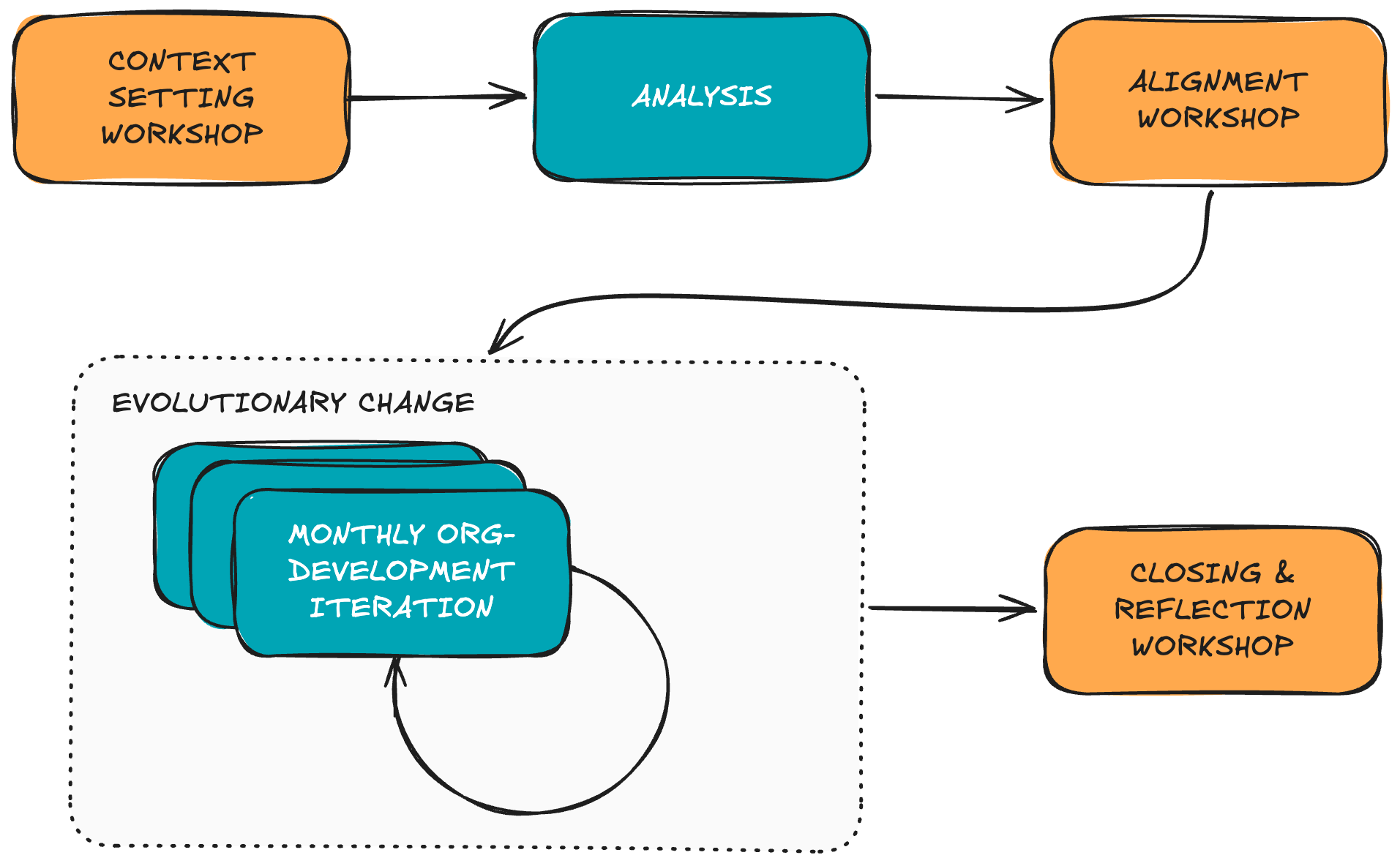 A key success factor is the combination of strong internal change coordination and close collaboration with the leadership team. Evolutionary change needs both: people inside the organization who actively drive the work forward, and leaders who provide direction, address tensions, and enable the decisions needed for real progress. This is how change becomes part of actual organizational development rather than a disconnected initiative.